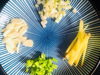 切葱花,把葱白和葱叶分开放、切丝、蒜切片备用