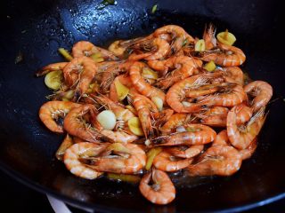 放入虾翻炒至变色