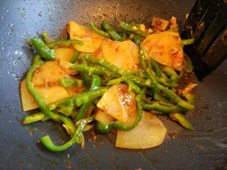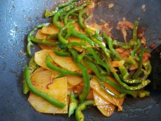 土豆片炒至半熟,倒入尖椒,快炒至断生。