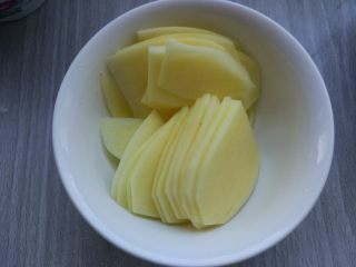 去皮,切片,用水冲洗一下,这样炒的时候不会粘锅。片不要切太薄,2毫米厚左右即可