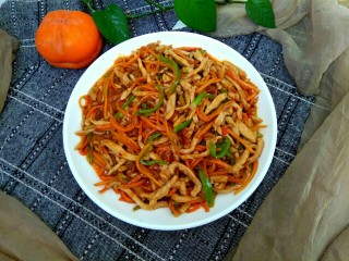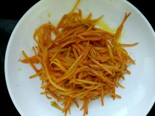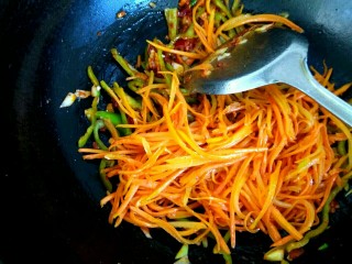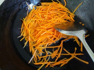炒锅放入适量,放入胡萝卜丝炒出红汤