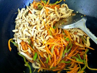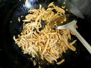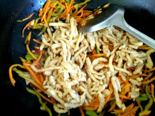 锅中加入适量植物油,放入鸡丝翻炒至变色