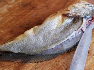 把黄花鱼放在菜板上、用刀先在黄花鱼的头部开始片刀到黄花鱼的鱼尾处、切记不要把黄花鱼的肚子切开呀
