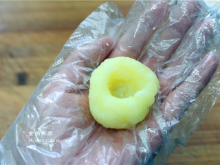 土豆片倒入高脚盆里,调入2克盐、用压泥器把土豆压烂,没有压泥器就直接用叉子或用手捻碎。
