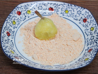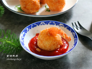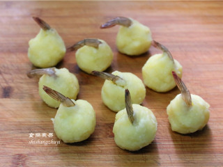 取两个鸡蛋打撒,划成细腻的蛋液,将包裹土豆泥的虾仁在鸡蛋液里滚一下。