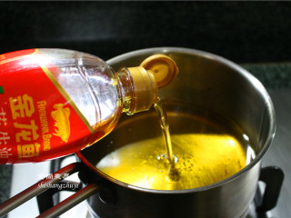 分量不多,咱们就用小一点的锅来油炸,这样的话就可以省油省时间。锅里倒入食用油,大火煮开。