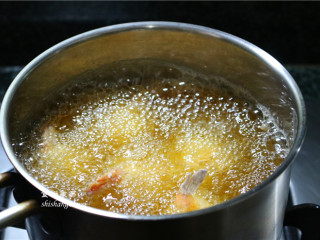 当油温升高,取一根干爽的筷子插入油里,周围会冒出很多小气泡,此时将土豆虾球放入油锅中,大火炸至虾球定型,再调成小火,这时才用筷子翻动一下虾球,以便土豆泥炸的更均匀。炸至虾球两面焦黄色,捞起放凉,再放入油锅中大火复炸一次,逼出虾球中的水分和余油。