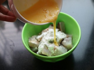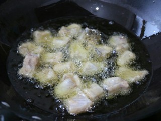 锅内倒入能浸没鱼块的油,油烧热后,下入腌制好的鱼块炸