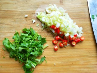 来做凉拌汁:碗内放生姜大蒜,小米椒,放一勺,盐。