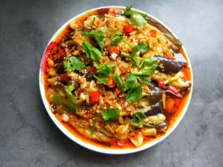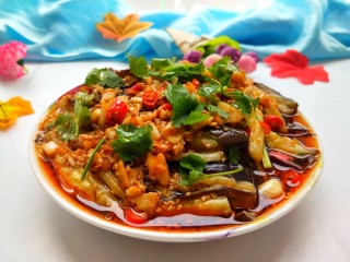 将凉拌汁倒入茄子中。