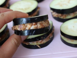 将肉馅塞入茄子中间。