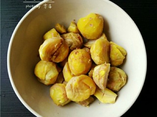 煮好的板栗,不烫手的时候,立即剥掉板栗壳、板栗衣;