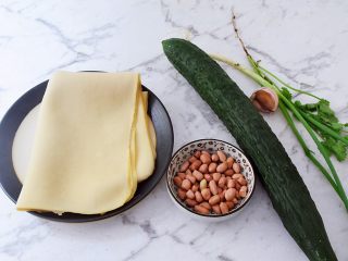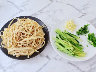 洗净从一边卷起来,再切成条状,洗净切成丝,蒜切末,切葱花,切寸段