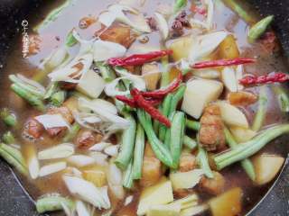 加适量开水至与菜平齐的程度。放入干辣椒、八角、葱姜蒜、盐、一小勺老抽熬煮