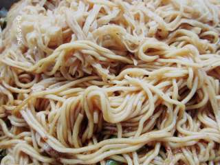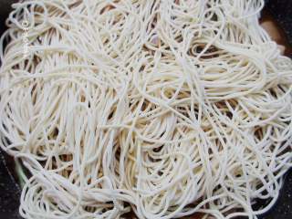 中途可以用筷子扒开锅底的小口,看一下菜汁是否收干。如果汤汁收干而面不太熟,就兑加少量热水至汁差不多干了,面也熟了的程度。 切记:中途不要翻动面条。在面条熟之前翻动就会使面条糊化成一坨了。焖好后,再用筷子把面条扒拉散开,使面与菜混合好