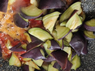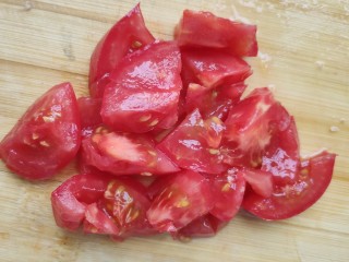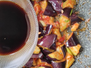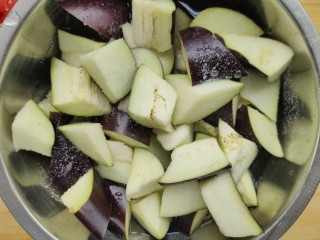 将先切条再滚刀切成块,放入盆中加入盐腌制,使茄子中多余的水稀释出来,这样不至于水唧唧的口感。