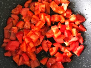 起锅烧油倒入番茄丁,炒至番茄出汁。