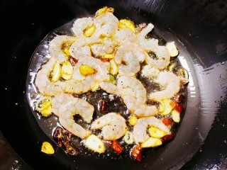 翻炒至虾仁变红后除去蒜,葱和辣椒