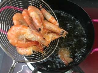锅中加入适量食用油,待油温升高,把虾放入,炸至微黄后捞起。