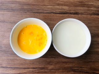把2个鸡蛋磕入碗里,打成蛋液待用,淀粉放入碗里,倒入适量水,搅拌成水淀粉待用。