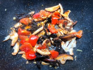 热锅放入少许油,把西红柿放入,小火煸炒出汁,再把姜末放入炒出香味,加入木耳和香菇放入翻炒一下。