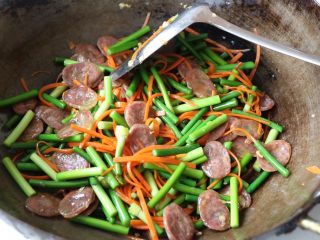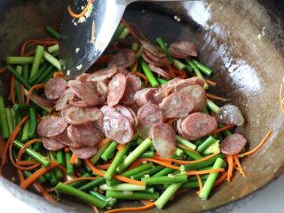 倒入腊肠翻炒;