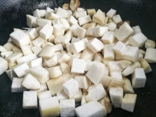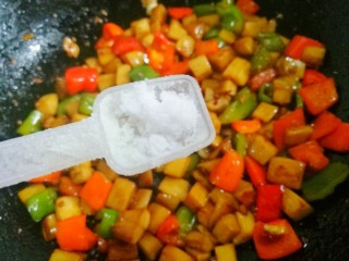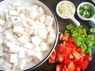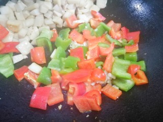 杏鲍菇铲到一边,锅中加适量油,下入姜蒜爆香,加青红椒大火翻炒片刻。