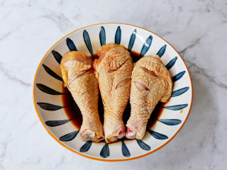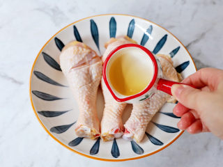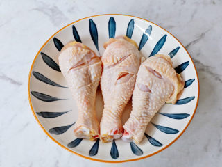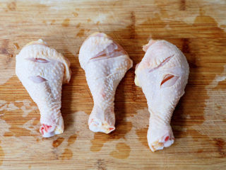 首先将放入清水中浸泡半小时,泡出血水后冲洗干净,再将鸡腿两面各划2刀