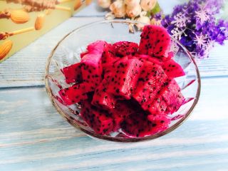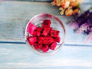 取一个玻璃杯,将1/3的火龙果粒放入玻璃杯中