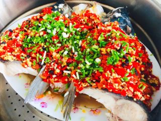 淋在葱花上面。超级下饭的剁椒鱼头就做好了,多的汤汁还可以用来拌面。都很不错。