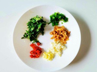 切葱花,香菜段。末,蒜末,菜脯丁,辣椒圈。