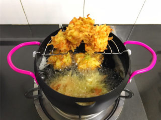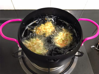 等炸到可以定型后翻面炸另一面,其间要用筷子翻拌一下,防止糊锅,炸至两面呈金黄色后捞出控油。