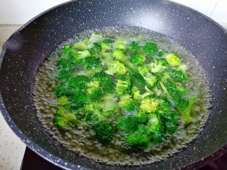 另起锅加水烧开,放入西兰花焯水,加一点点盐。想要做好的西兰花颜色碧绿,可以加一点点的小苏打,焯水一分钟捞出控水。