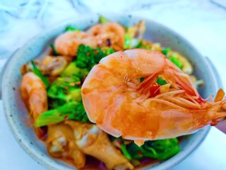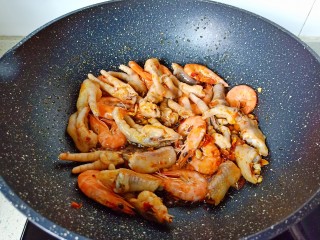 放入焯好的鸡爪与对虾翻炒一下。