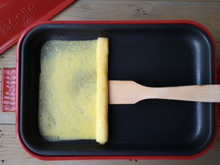 待蛋液稍凝固利用硅胶刮刀或木铲折叠蛋皮从右端卷起。
