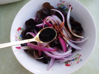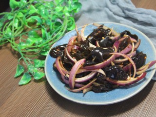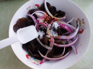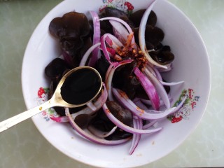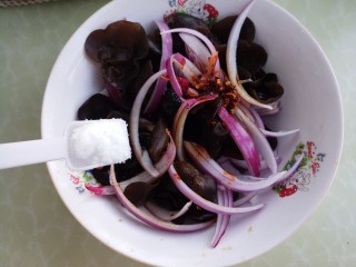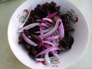 然后把洋葱和木耳放在一个碗里。