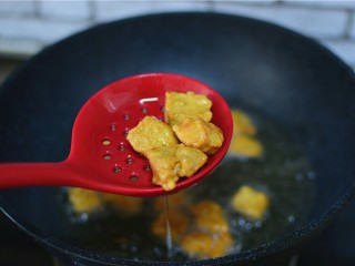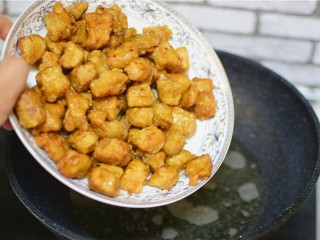 锅中油七成热,炸肉段