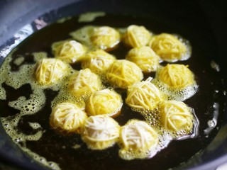 锅中下半锅油,烧至五成热,放入包裹好的鹌鹑蛋小火慢炸,边炸边轻轻晃动锅。