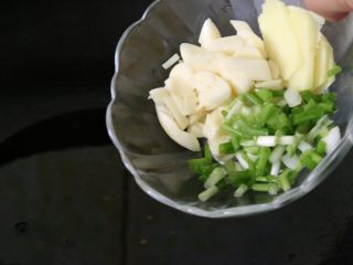 焯水断生后,豆芽菜捞起放入碗底铺好备用。