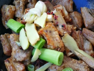 再放入葱姜蒜花椒八角继续翻炒,要不停的翻炒,直到锅底有些油被炒出闻到香味为止,这是这道菜好吃的关键。