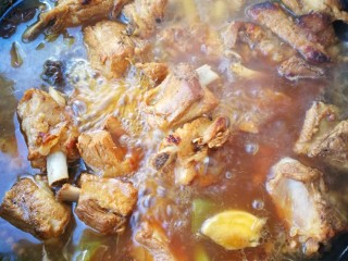 加入水淹过排骨,给两勺一勺大火烧开。