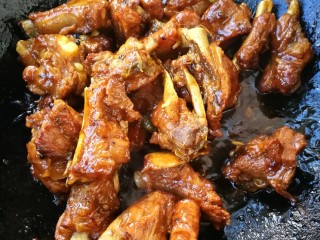 迅速翻炒均匀,让糖均匀的裹在排骨上,然后倒入两勺。继续翻炒