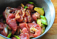 肉片放进大碗,加入所有腌料,手抓匀,腌制3小时以上