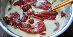 炸至肉片两面嫩黄硬挺,捞起肉片放在一边沥油,并依次炸好其余肉片
