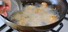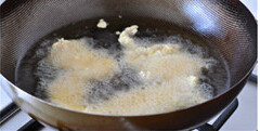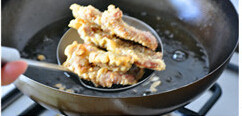继续加热锅中的油,至8、9成热,下入炸过的肉片,迅速翻动至两面金黄酥脆