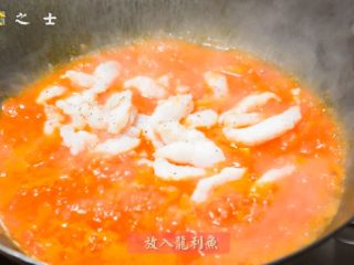 番茄炒好后,根据自己龙利鱼的数量,加入小半碗水左右~ 烧开后,放入烫熟的龙利鱼~