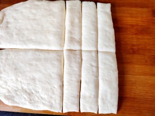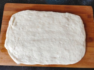 发好的面团轻轻拍扁,擀成长薄饼状。