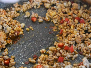 油锅下肉末,炒至断生倒入一勺豆瓣酱炒香
