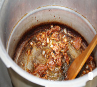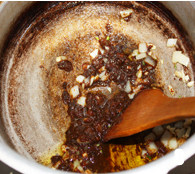 高压锅放入火上,放入适量油,待油温高后放入洋葱、蒜粒翻炒,放入酱翻炒;