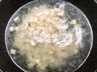 加入一大碗清水,大火烧开,加入适量盐,再加入豆腐大火煮10分钟,豆腐煮的时间久一点更好吃哦。